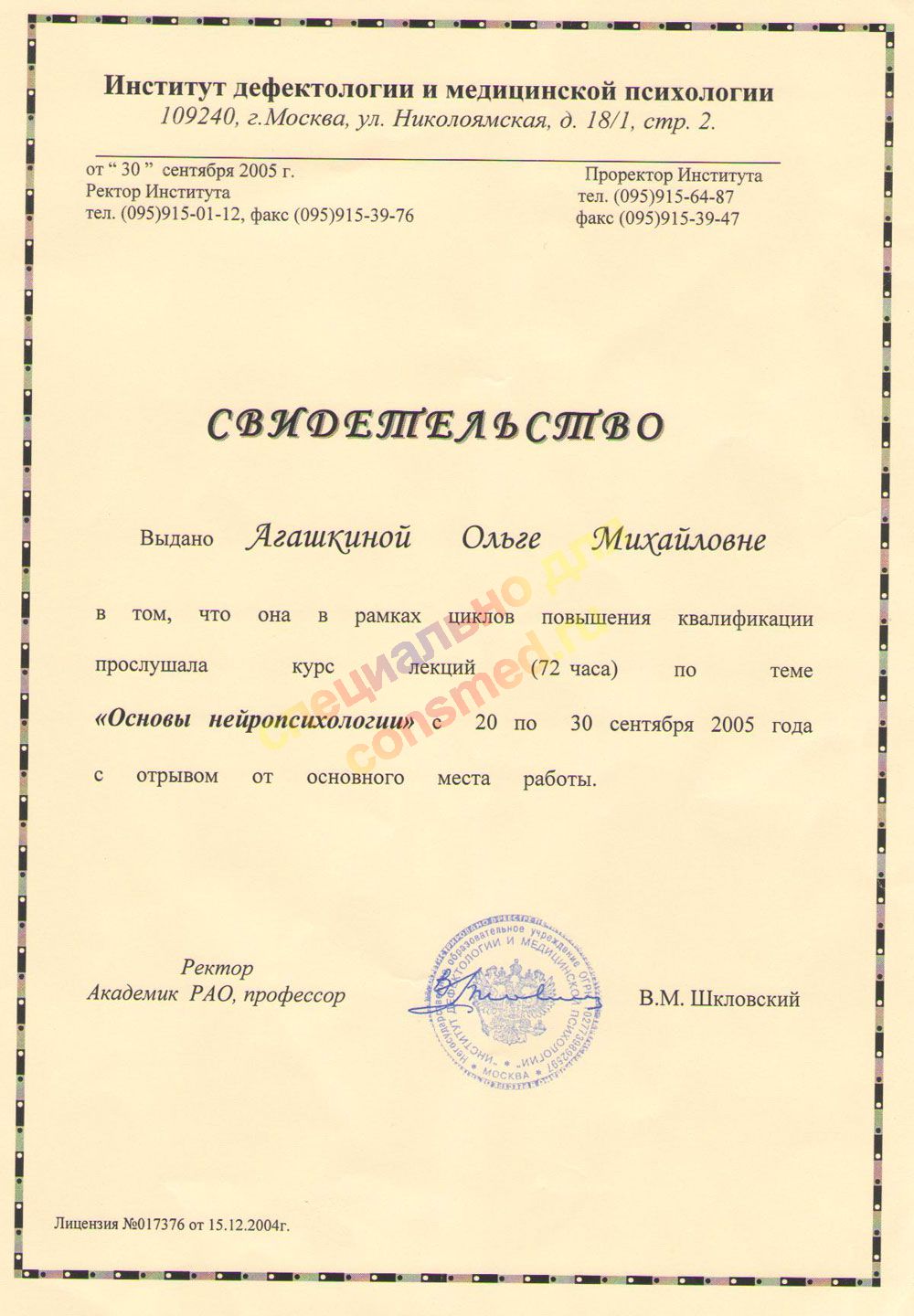 | Свидетельство Тип: Сертификат о прохождении курсов (без присуждения доп.квалификации) |