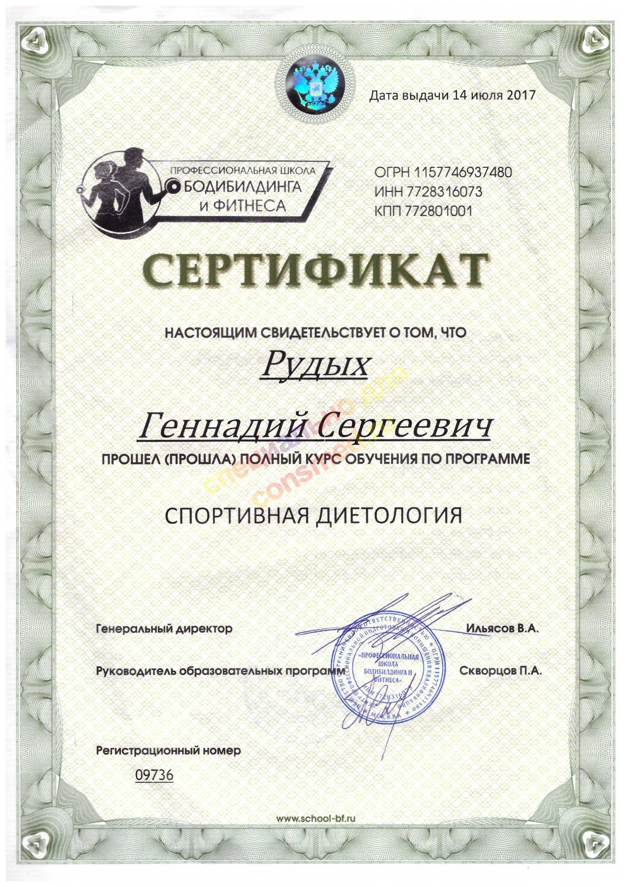 | Спортивная диетология Тип: Сертификат о прохождении курсов (без присуждения доп.квалификации) |